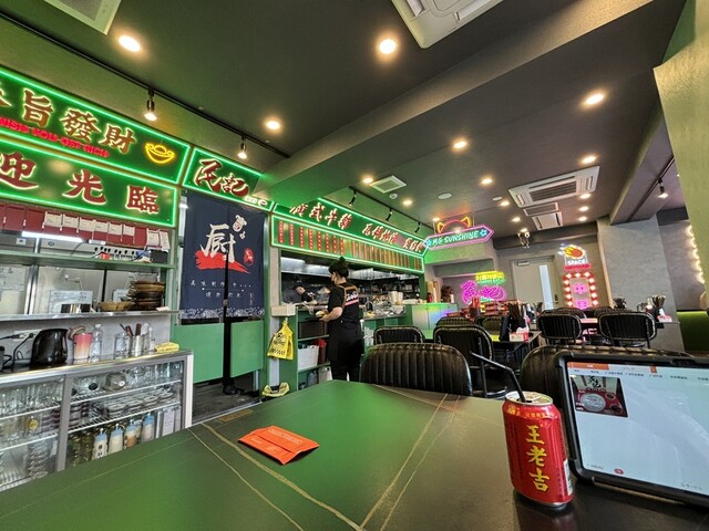 土鍋ご飯だけじゃない、本場・広州でも親しまれる広東式牛もつ煮込み鍋。ネオン風照明が映える店内