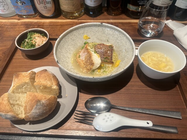 鯛は皮面がパリッとローストされてて美味しい。スープがポタージュになっていて、ただのポタージュじゃなくて花の香り?なんのにおいかわかりませんが食欲を誘ういい匂い。