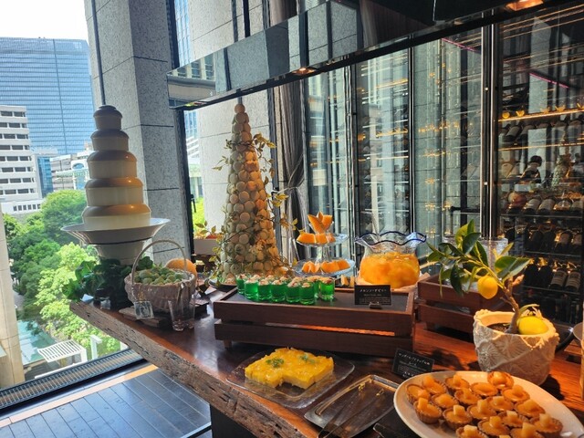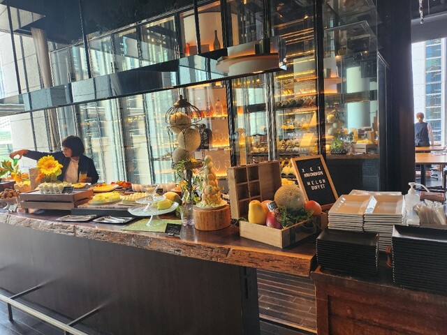 土日は全然予約が取れないので、金曜日有休を取って伺いました。受付カウンターがあり11時になったら予約順だと思いますが、○○様と呼ばれて一組ずつ丁寧に席まで誘導してくれます。手前はゆったりソファー席で奥はテーブル席エリアで広くて落ち着く空間で、やはりジャズが流れてます。客層は平日もあって40歳以上の方が多い感じでした。メロンやスイーツだけでなくローストビーフやパスタ、ピザも食べれるので、甘いとしょっぱいのループを楽しめます。ドリンクバーカウンターにスタッフが居るので飲み物を切らすことなく綺麗な状態にされてます。バーカウンターのスタッフがメロンのモンブランをサーブしてくれるのも映えを意識した演出が出来ていて、楽しめましたが、やはりメロンのモンブランは甘すぎました。秋に栗のモンブランを食べに来たいです。