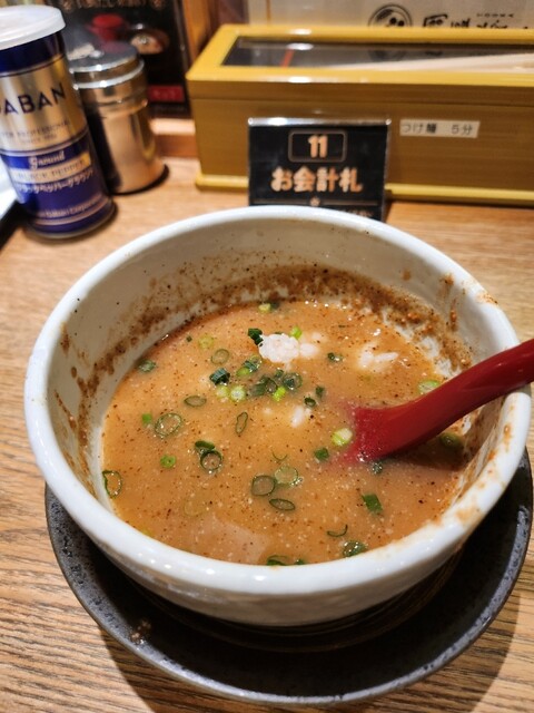味噌ラーメンの気分でしたが、灯花の前を通りかかったら秋季限定「明太子つけ麺」の看板が出ていたので、吸い込まれるように入店しました。何度か来てますが、灯花のつけ麺は食べてませんでした。鯛だしと明太子のコラボですが、何だか蟹味噌みたいな味がしました。濃厚で美味しかったので、白飯をつけ汁に入れたい衝動にかられ割りスープとれんげ1杯の追い飯無料をお願いしました。タラコ好きには何杯でもいけちゃうやつです。普通の白飯1杯頼んでも良かったな~と思うほどしょっぱ旨かったです。もうちょっと多めにスープ入れてくれればあっさり頂けるかな?と思いますが、疲れてる私の身体にはちょうど良かったです。