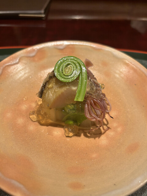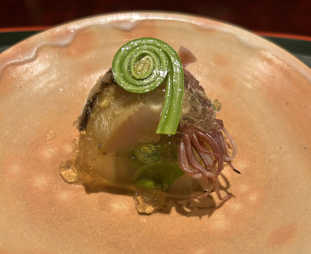 春野菜煮凝り 蛍烏賊 鮑 こごみ 新生姜千切り添え
