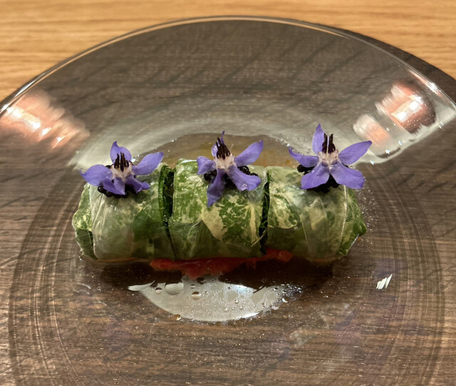 桜鱒 グリーンアスパラガス トマト ライスペーパー仕立て