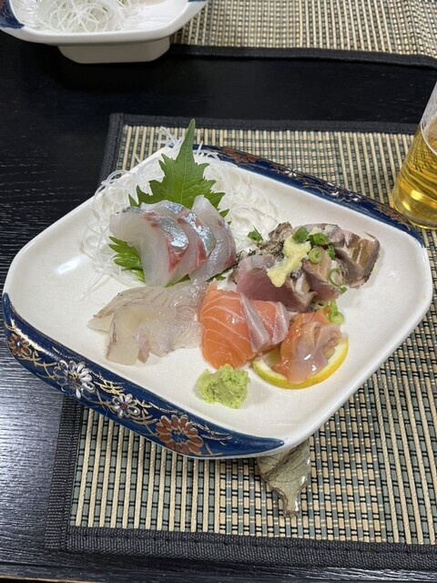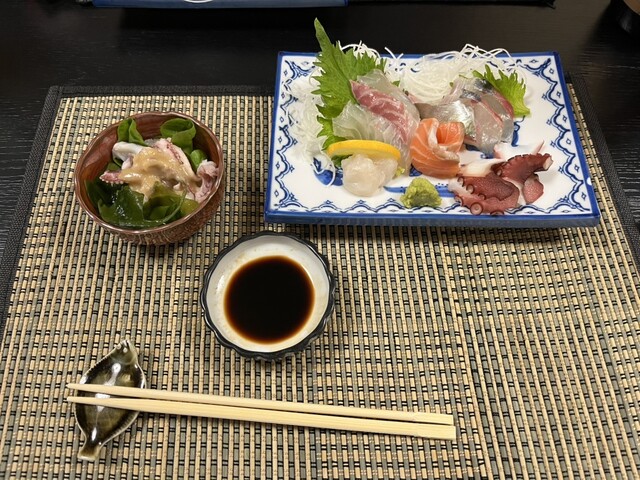 イカゲソとワカメの酢味噌和え、たい、しまあじなどの新鮮なお刺身がとっても美味しい