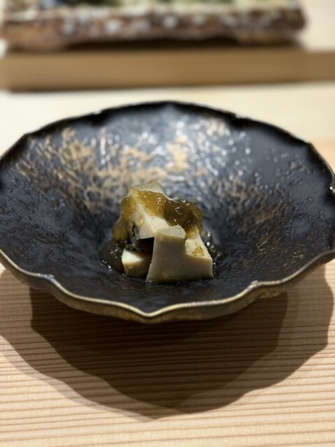 美味しすぎてニコニコしてたら次なるスペシャリテ:あん肝干瓢巻の登場。
