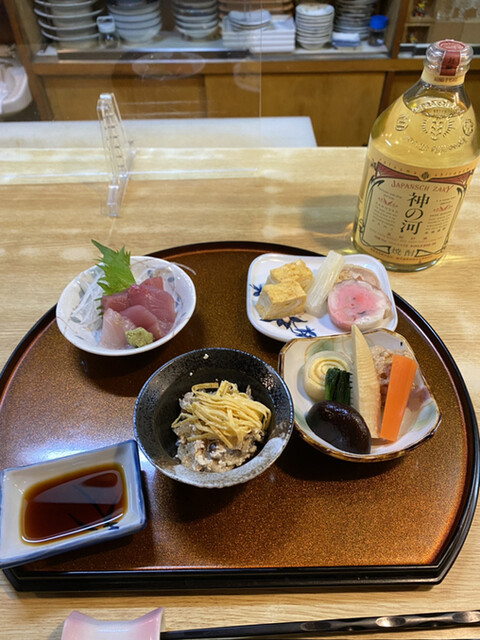 おつまみセット 刺身、煮物、小鉢、小皿で1,000円、天ぷら追加で1,500円。