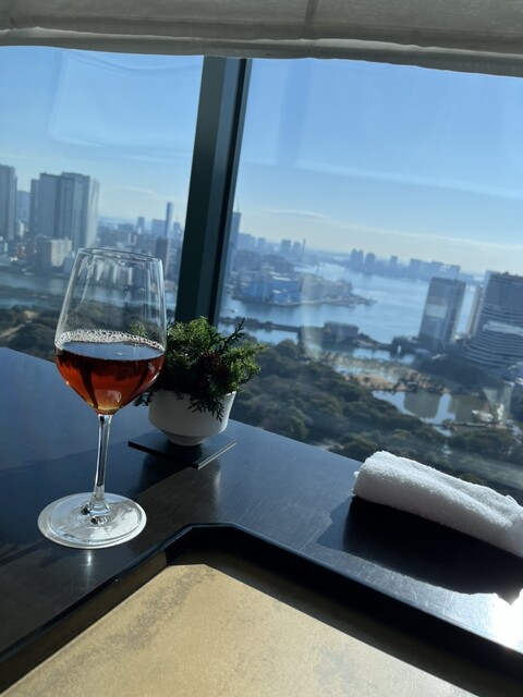 コンラッド東京の28階、窓際のお席に通していただきました。浜離宮公園が見下ろせて、奥には海が見えます。とても明るく開放的な店内でした。お昼だったので日当たりが良すぎて少し暑くなってしまいましたが、素敵な時間を過ごせました。