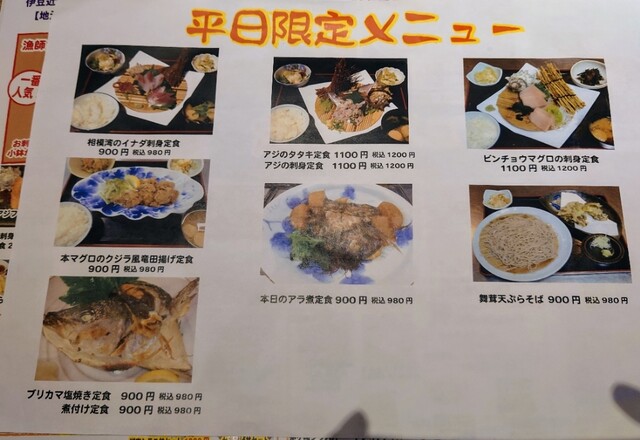 「漁師定食」は、天ぷら、刺身、鯖味噌煮、ひじきで、ボリュームのある定食です。