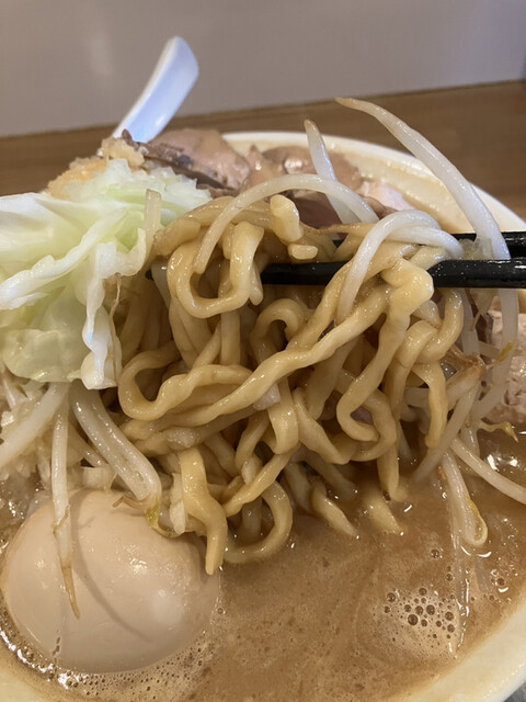 麺は太ちぢれ、歯応え、スープの絡みも良く、