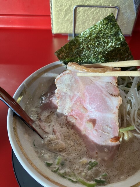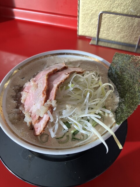 スープは白濁した泡スープ、山盛りの白髪ネギ、青刻みネギ、大きなレアチャーシュー2枚、海苔、そしてしっかりと背脂もチャッチャッされてます