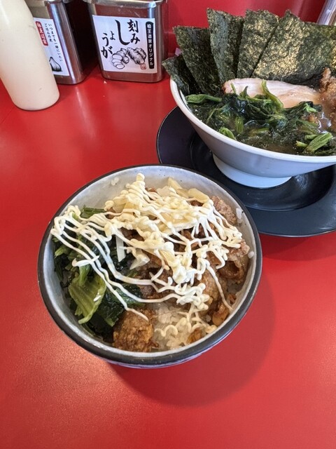 そしてライスには滋養強壮の無限ニンニクをたっぷりのせマヨ掛け、スープに浸した海苔で巻いていただくと昇天する美味さ