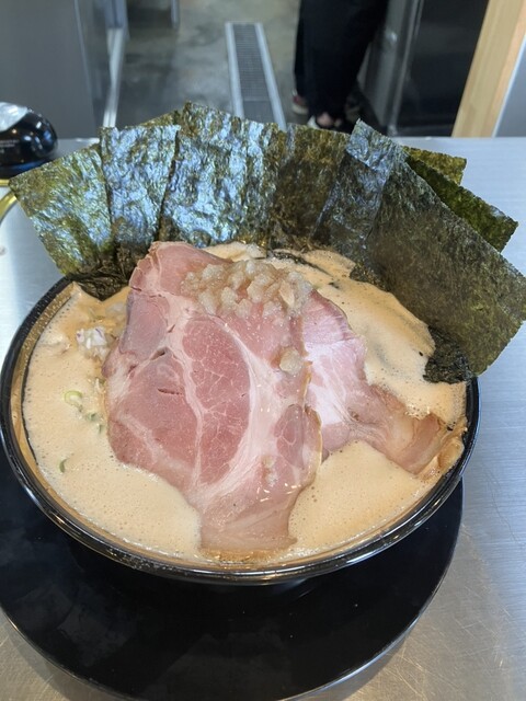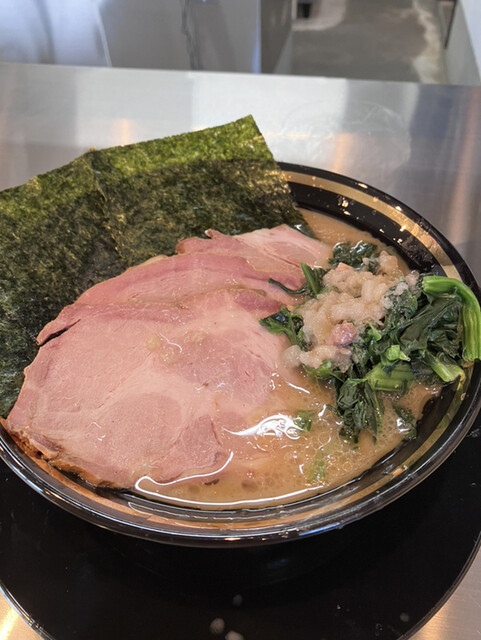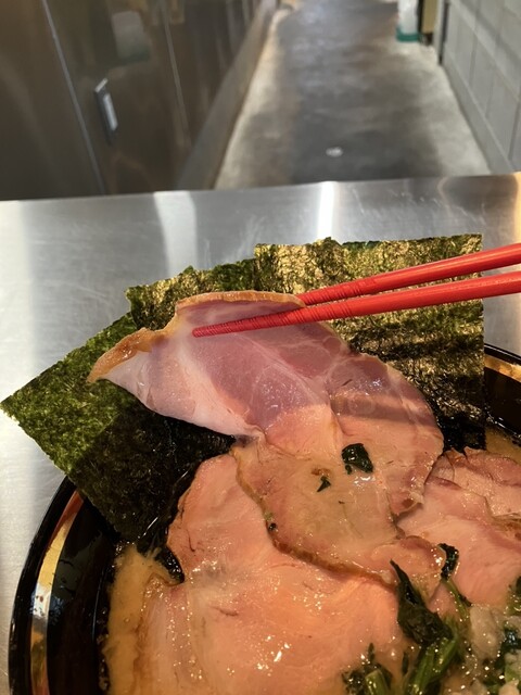 チャーシュー3枚、海苔3枚、ほうれん草、牛脂?