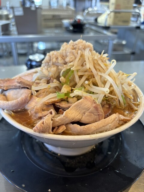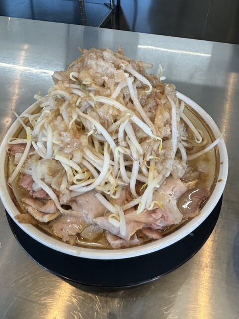 モヤシ山の麓には薄切りチャーシューが詰め込まれ、山頂にはアブラが降り積もってます