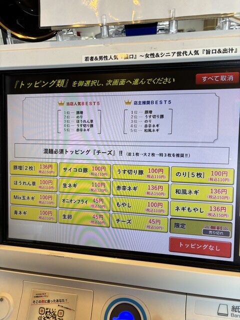 麺は極太を選択しましたので茹で硬さの拘り調整は出来ませんでした(券売機でボタン表示されません)