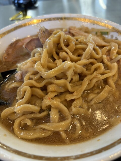 麺は極太ちぢれ麺、こちらも噛みごたえがあります、チャーシュー、麺量も多く最後は顎が疲れてきました