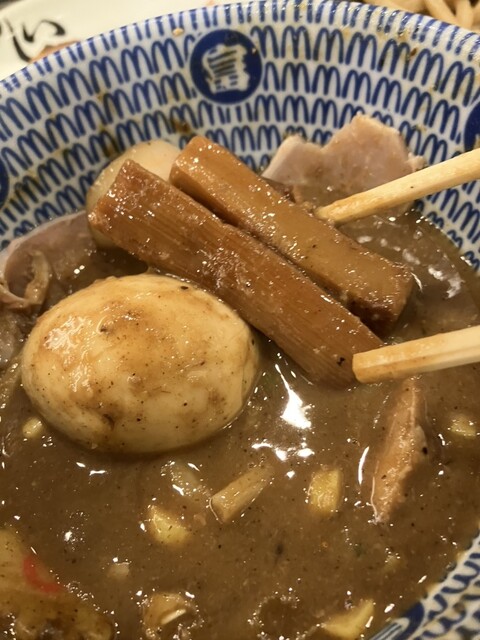 つけ汁の中には極太メンマも入ってましたよ、筋感はなく食感も良かったです