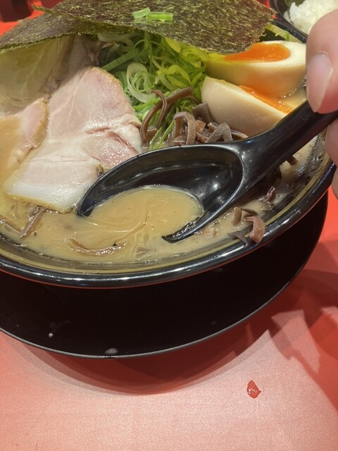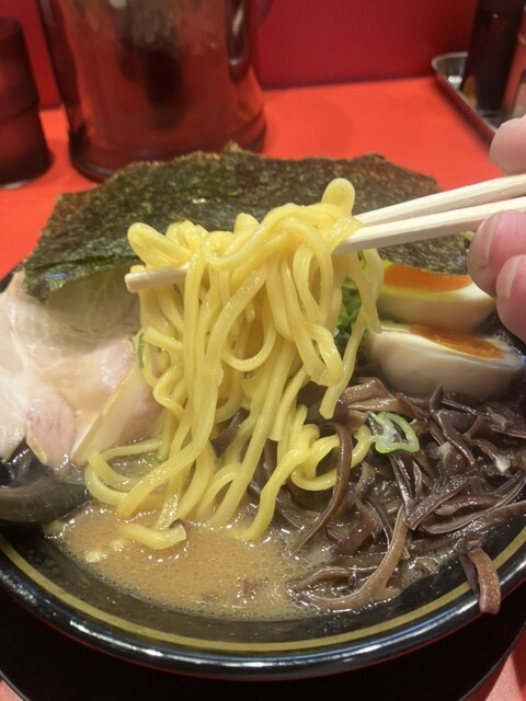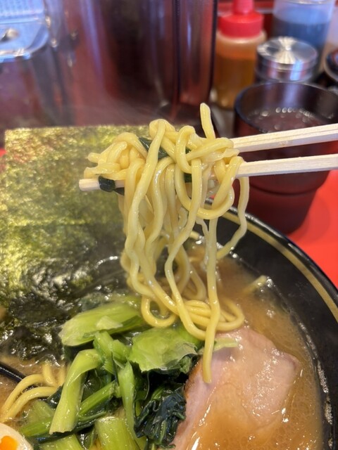 スープは油多めのためレンゲには鶏油が流れ込みます、3口程啜ったあと麺をリフトアップ!平打ち中太を啜るといい塩梅の茹で加減でもっと啜りたいですがライスを頬張ります、最高家系ラーメンにライスは欠かせませんね