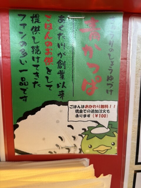 前回伺った時から青かっぱ、にんにく醤油、平日ライス無料、サービスも向上し★もアップです