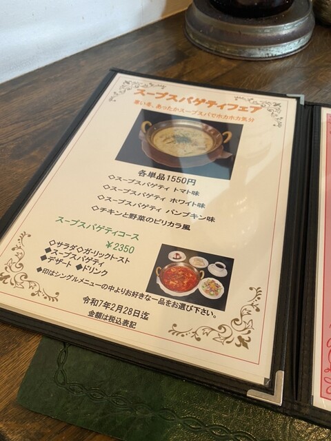 休日の昼過ぎごろ、駐車場1台だけ空きありました。お客さん絶えない人気店のようです。海と山の幸のパスタLサイズをいただきました。Lサイズまで同一価格です。