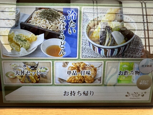 冷や汁うどんとカレーうどん(私:前日からどの店でも二択決め)、冷やしかき揚げうどん(家内)、こぶしセットの冷たいそばに鳥そぼろご飯・かき揚げ・小鉢付き(長女夫)、鴨汁うどんに海老フライのトッピング(長女)をタブレットで11:54に注文完了です。12:21以降に次々到着しました。