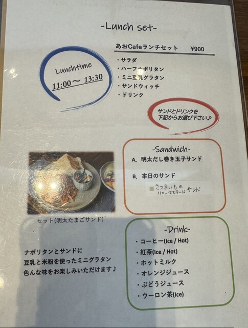 本日のお食事は、ナポリタン&手作りシフォンケーキセット(500円)のみとのことです。限定15食ですって。それを二つ(500円×2)とアイスカフェラテ(300円)、アイスコーヒー(300円)にしました。