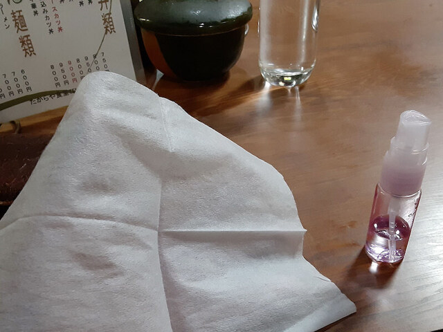 先ずは持参のアルコールタオルとアルコールで、手指とテーブルの上を除菌(-。-)y-゜゜゜。