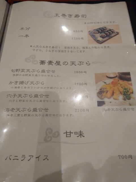太巻き(ハーフ)、海老天ぷら盛り合わせ、粗びき田舎、すだち蕎麦、お酒など飲み物少々。