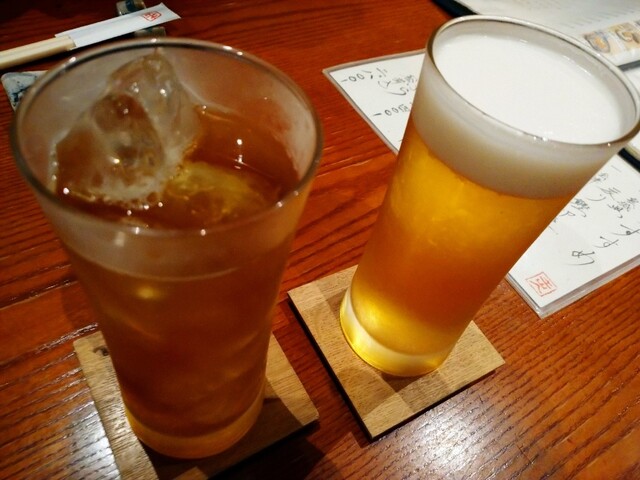 オーダーは、戻り鰹叩き、秋野菜と揚げ豆腐、太巻きハーフ、厚きりハムカツ、