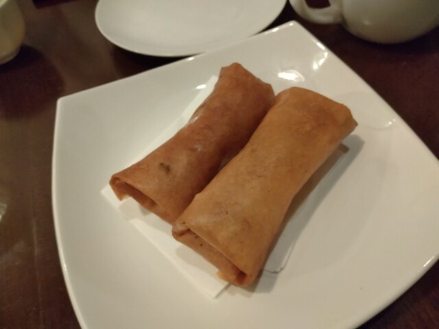 海老の春巻き、旬野菜のベーコン炒め、シンプルチャーシュー炒飯、中国茶など。
