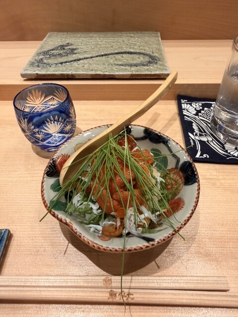 今回はカラスミをお餅と海苔で巻いて、変わった食べ方でしたが斬新でした。お酒もいつもこだわりの、ある日本酒でお料理もお酒も大満足でした。