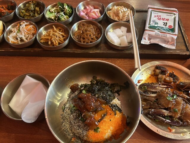 金曜日の13時ごろに行きました。他の店はおひとり様×なところが多かったのですがここは入れました。平日でも20分くらい並びました。カンジャンケジャンとセウのランチメニューを選びました。