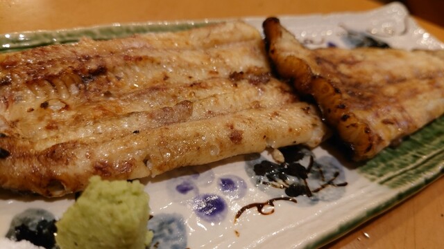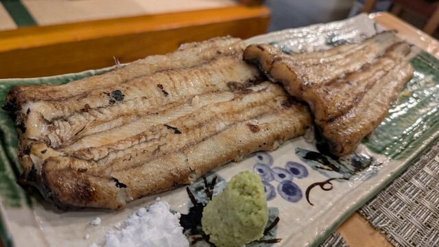 「うなぎ白焼き」もオーダーしました。思った以上に大きな盛りで、まるまる1匹分が提供されるのには驚きました。ふっくらとした食感で、べちゃっとした感じは全くありません。わさびや塩で味変を楽しむことができ、これもまた日本酒が進みます。