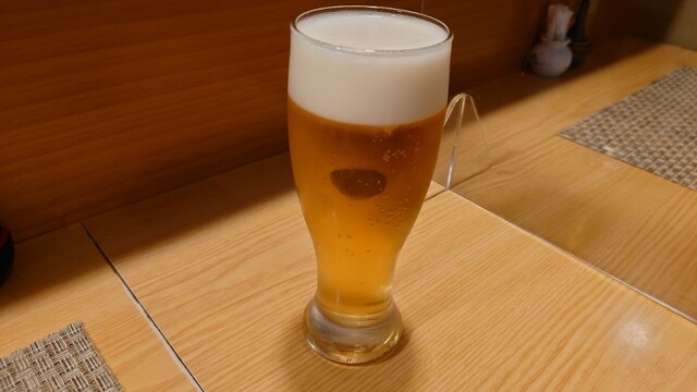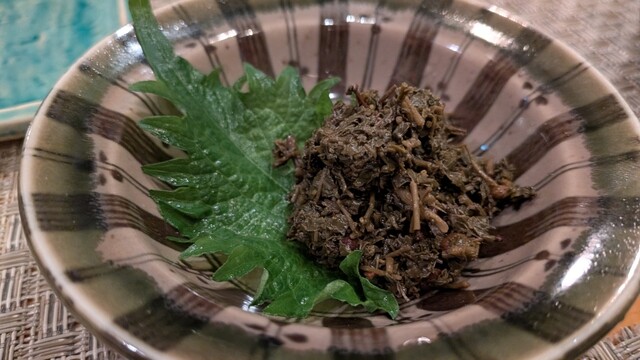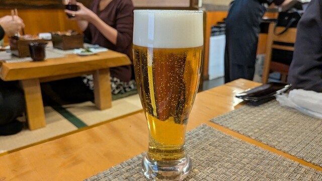 まずはビールで乾杯し、つまみとして「葉唐辛子の佃煮」を注文。辛味は全く感じられず、甘じょっぱい味わいが楽しめます。これがまたご飯と一緒に食べたくなる美味しさです。