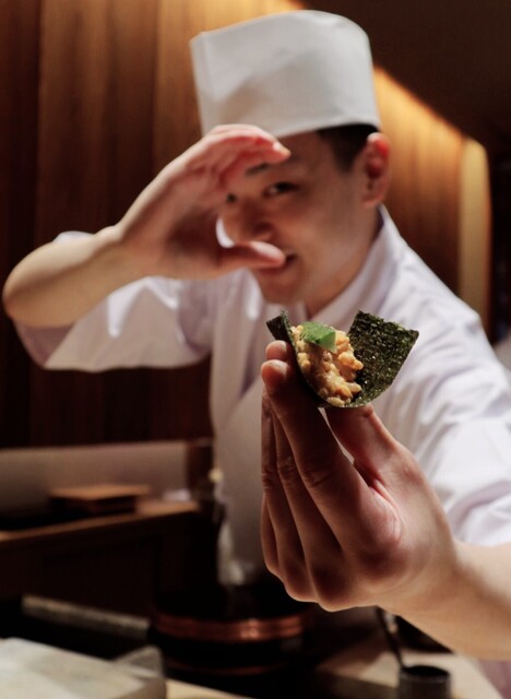 『港区巻き』は、『プリン巻き』に北海道産の蟹と雲丹、さらにキャビアをトッピングしブレンド海苔で包んでいただく至福の一貫。キャビアは追加料金(+1,100円)で、静岡県産キャビアを使用しています。これらのメニューは季節により変わるのだそう。コース以外にも、『海老と紫雲丹』(1,500~2,000円 ※雲丹は時価)などの高級食材を使用した、追加の一品料理を常時用意しているそうです。