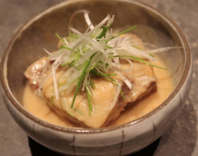 3日間かけて仕上げる「牛舌白味噌煮」は、針ネギ、芽ネギを添えて提供。牛舌は臭みがなく、トロトロの食感を味わえます。