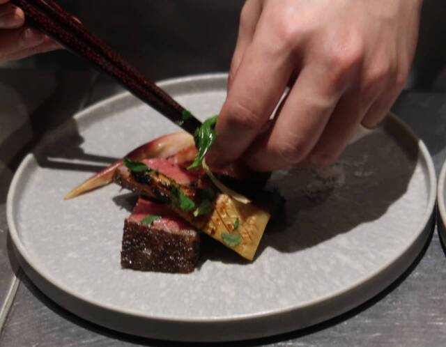 看板メニューの薪で焼く「牛のかまど焼」は、松阪牛のクラシタに、焼ウルイ、若荷子酢漬、タケノコ木の芽焼きを添えて提供。松阪牛は、口に入れた瞬間にとろけるような食感で、上品な脂の甘みを感じられます。