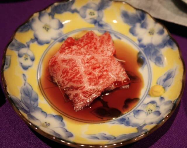 コース料理は、オリーブ牛のロース「純生肉刺し」で始まります。オリーブ牛は香川県のブランド牛で、オリーブオイルの搾油後に残る果実を飼料として育てられた黒毛和牛。さっぱりとした脂質で赤身のバランスが良く、コクがあり、やわらかい肉質が特徴です。
