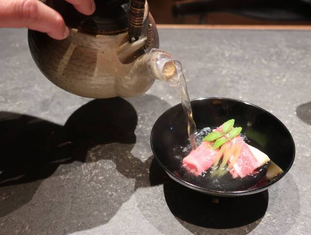 お肉を特製出汁で楽しむ「椀しゃぶ」は、オリーブ牛のリブロース、筍、わかめ、蕗、木の芽を入れたお椀に出汁を注いで和の香りでさっぱりと仕上げています。