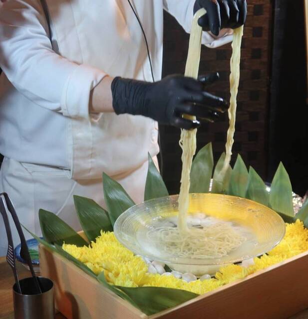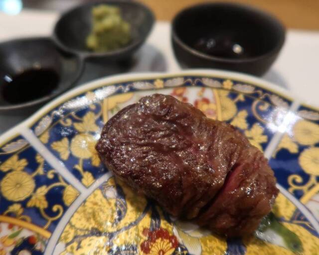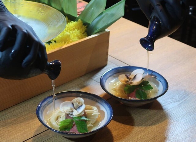 〆の冷やし仕立てで提供される「人 − jin − つけ麺」は、お肉シェフ×ラーメンシェフの初のコラボレーションの一品。昆布出汁に特製麺、高森和牛とハマグリを重ねた一杯。昆布の旨味が麺に絡み、驚くほどの一体感。熱々のつけ汁は、シジミや牡蠣オイルの旨味が重なり、飲み干したくなる美味しさでした。