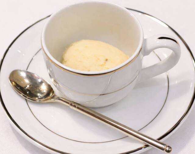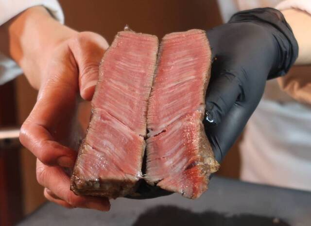 追加料金で注文できる特別メニュー「シャトーブリアン」もおすすめ。伺った日は、シェフによるミートカットや、炎のパフォーマンスも披露されました。厚みがありながら、驚くほどのやわらかさが印象的。丁寧な火入れにより繊維はきめ細かく、赤身の中心部ならではの旨味や濃厚な味わいを楽しめます。和牛のポテンシャルを存分に堪能できる特別な一皿です。