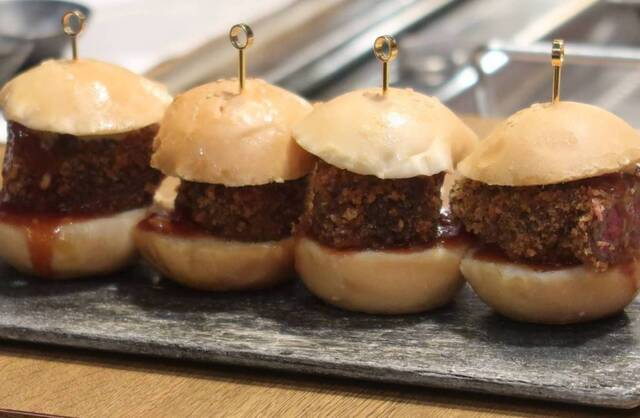 シグニチャーである「ヒレカツスライダー」は、最高級ヒレ肉をトリュフベーカリーのバンズと合わせたひと口サイズのバーガー。サクッとした食感の中からあふれる肉汁と自家製ソース、トリュフマスタードが重なり、旨みと遊び心を詰め込んだ一品。
