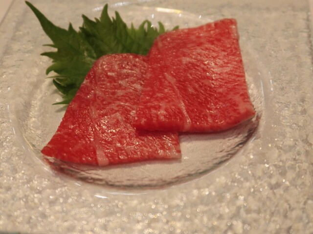 コースは、舌の上でほどけるような「とろけるお肉」からスタート。凝縮された肉の旨味が、これなら続く肉料理への期待を高めてくれます。「お肉刺し」は、しっとりとした食感と上質な旨みが際立ちます。