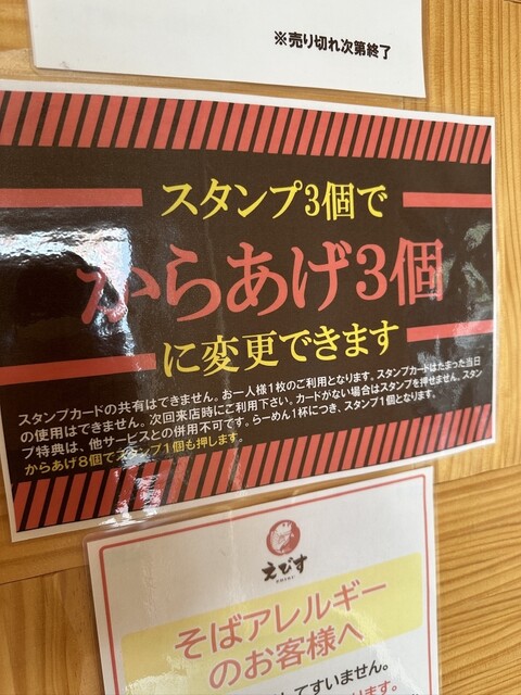えびすさんでは、かなりすごいサービスがあって、ラーメンを1食食べるごとにスタンプカードに1個スタンプを押してくれる。