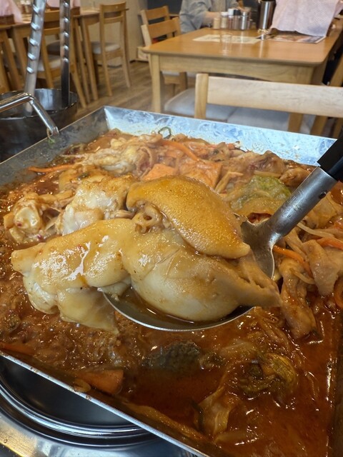 スープはピリ辛味噌で、酒粕入り。そしてキムチ、唐辛子。