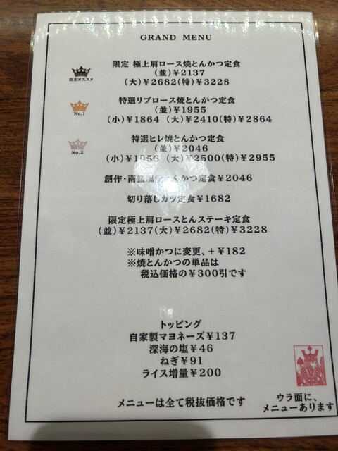 通常メニューのとんかつだが、この上にさらに➕300円〜でブランド豚の茶美豚もあるらしい