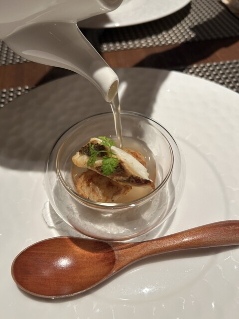 真鯛ポワレ あおさ焼きリゾートスープ仕立て