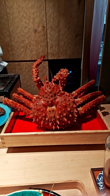 蟹は照明を暗くして生簀にスポットライトがあたり料理長が蟹を取り出し捌き 刺身、しゃぶしゃぶのレアらミデアムと食べる順番で甘さが増して行き、ハイライトの焼蟹が最も甘くと香ばしさを楽しめました。