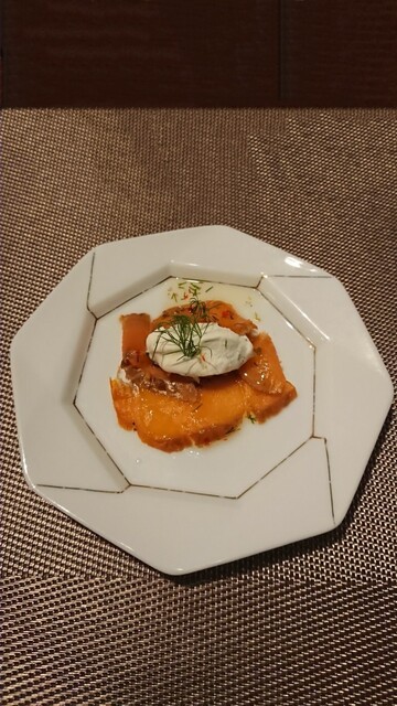 アミューズ 軽く燻製をかけた ノルウェー産 アトランティックサーモンのマリネ ディルの香り