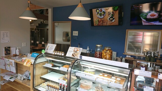 その入口のショーケースに 綺麗にお惣菜と焼き菓子が並びその奥がカフェスペースのようだが現在は閉鎖中のよう