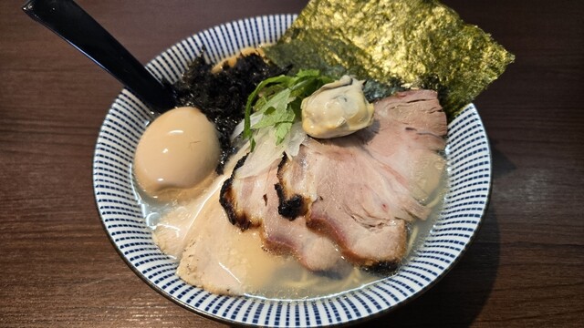 具材はチャーシュー2種(鶏と豚)×2枚、牡蠣、大葉、味玉など