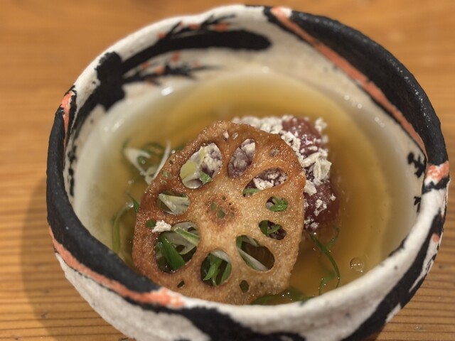 岐阜駅周辺の居酒屋はレベルが高くて良く利用しますが、まろうどが一番だと思います。本日も旬の懐石コース5500円を注文。季節感満載で手の込んだお料理が提供されます。家庭料理とはひと味違う料亭の味です。「美味しい」と思わず言ってしまうと、大将がニッコリして、お料理の説明をしてくれます。飲み物込みで一人7000円ちょっと、価格も良心的でホンマお勧めです。